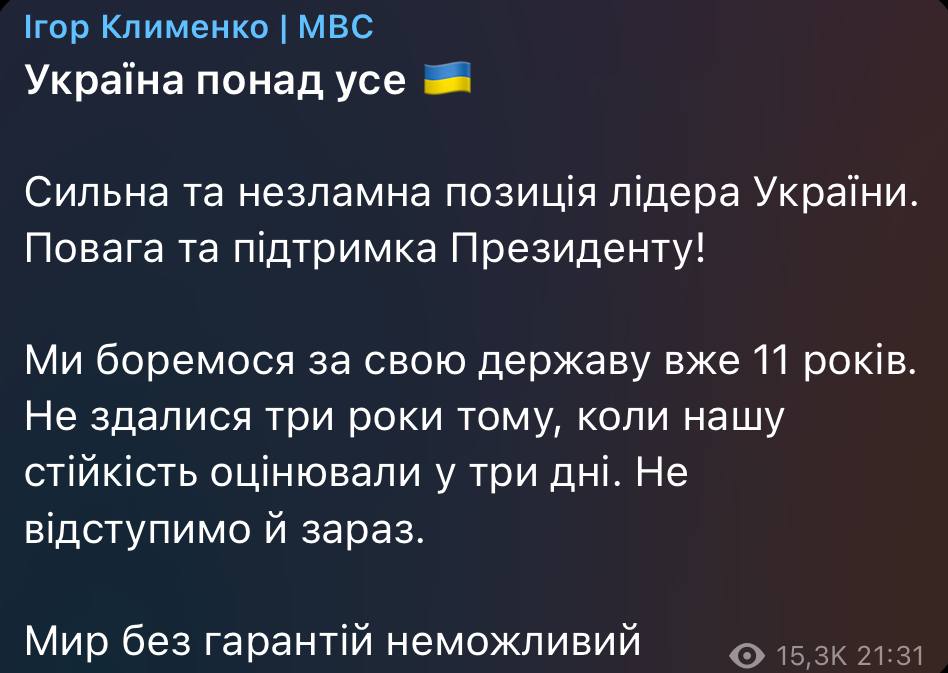 Міністр внутрішніх справ Ігор Клименко підтримав позицію президента України Володимира Зеленського на зустрічі з Трампом у Вашингтоні.