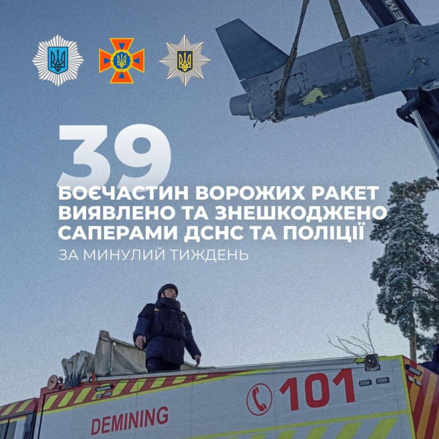 Сапери системи МВС протягом тижня знешкодили 39 нездетонованих бойових частин ворожих ракет різних типів.